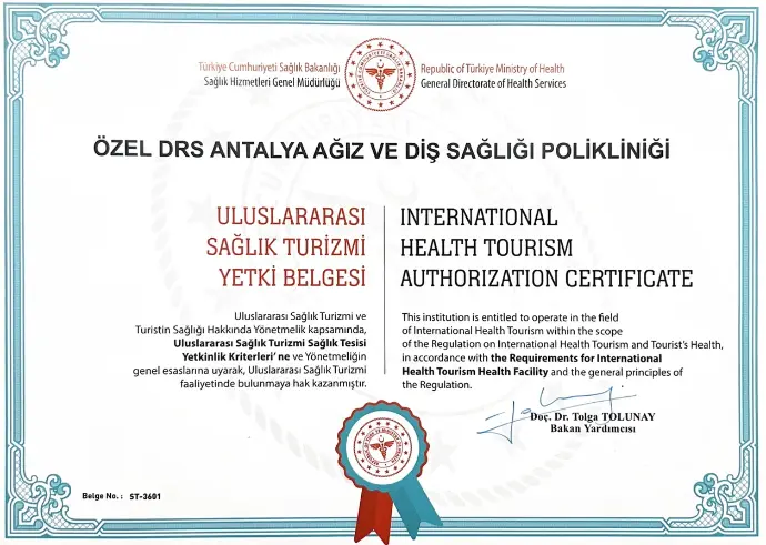 At Dr Smile Antalya, we are proud to hold the International Health Tourism Authorization Certificate, an official recognition issued by the Turkish Ministry of Health.